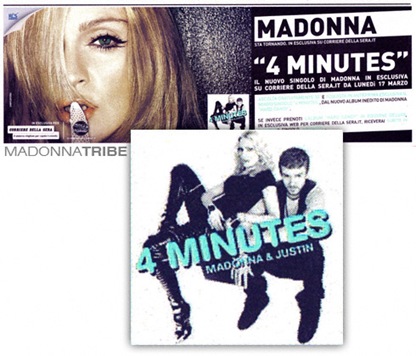 Madonna & Justin's new single 4 Minutes will be available to listen for free as a 30'' preview and to purchase as digital download exclusively from corrieredellasera.it on March 17. Source